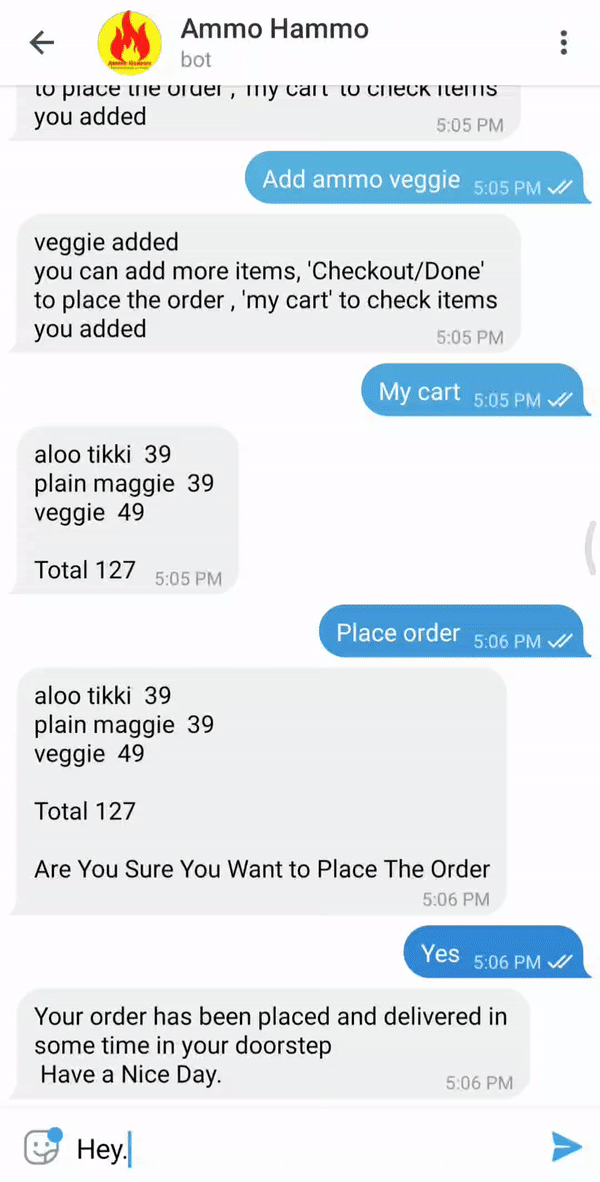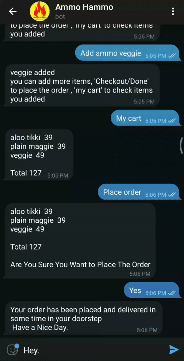 - You can checkout the test chatbot for this project at Telegram or search for @Foodtest2bot from mobile app.